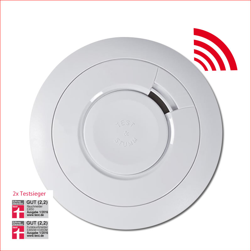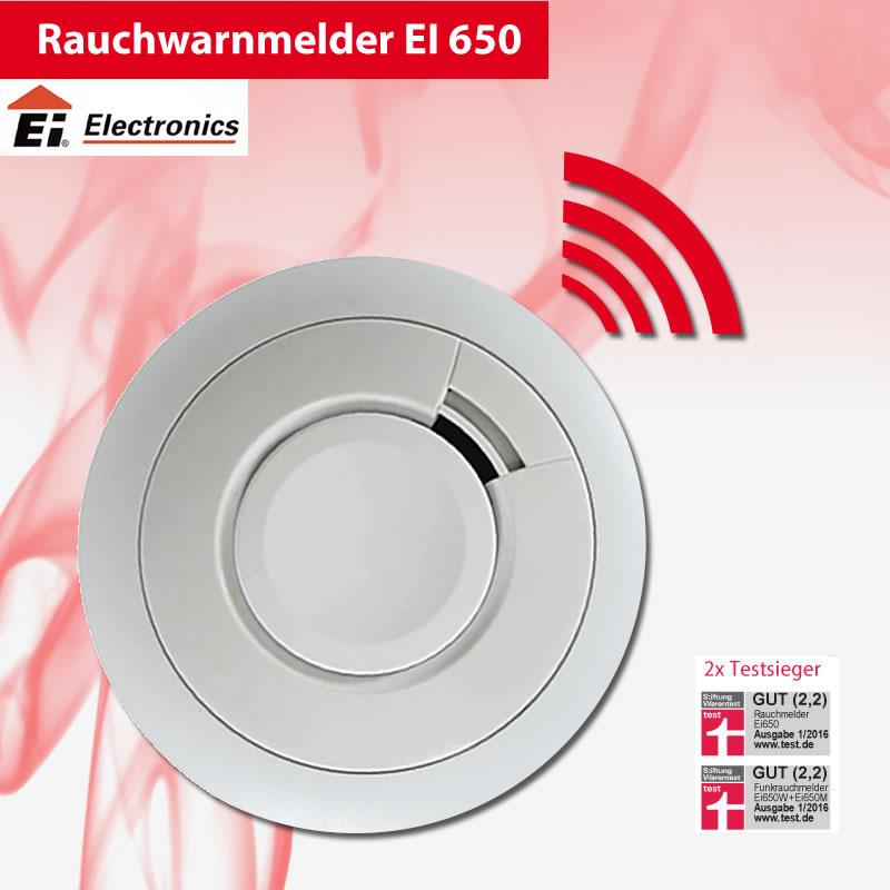 Modell ei-650. Qualitätsrauchmelder mit fix eingebauter 10-Jahres-Batterie. – Automatische Selbsttestfunktion. – Easy-Press-Button für Stummschaltung und Test. – Für Schlafzimmer geeignet, weil ohne LED-Blinksignale. 10+1 Jahre Lebensdauer. 5 Jahre Garantie. Einfache Montage. Testsieger 2016 bei Stiftung Warentest.