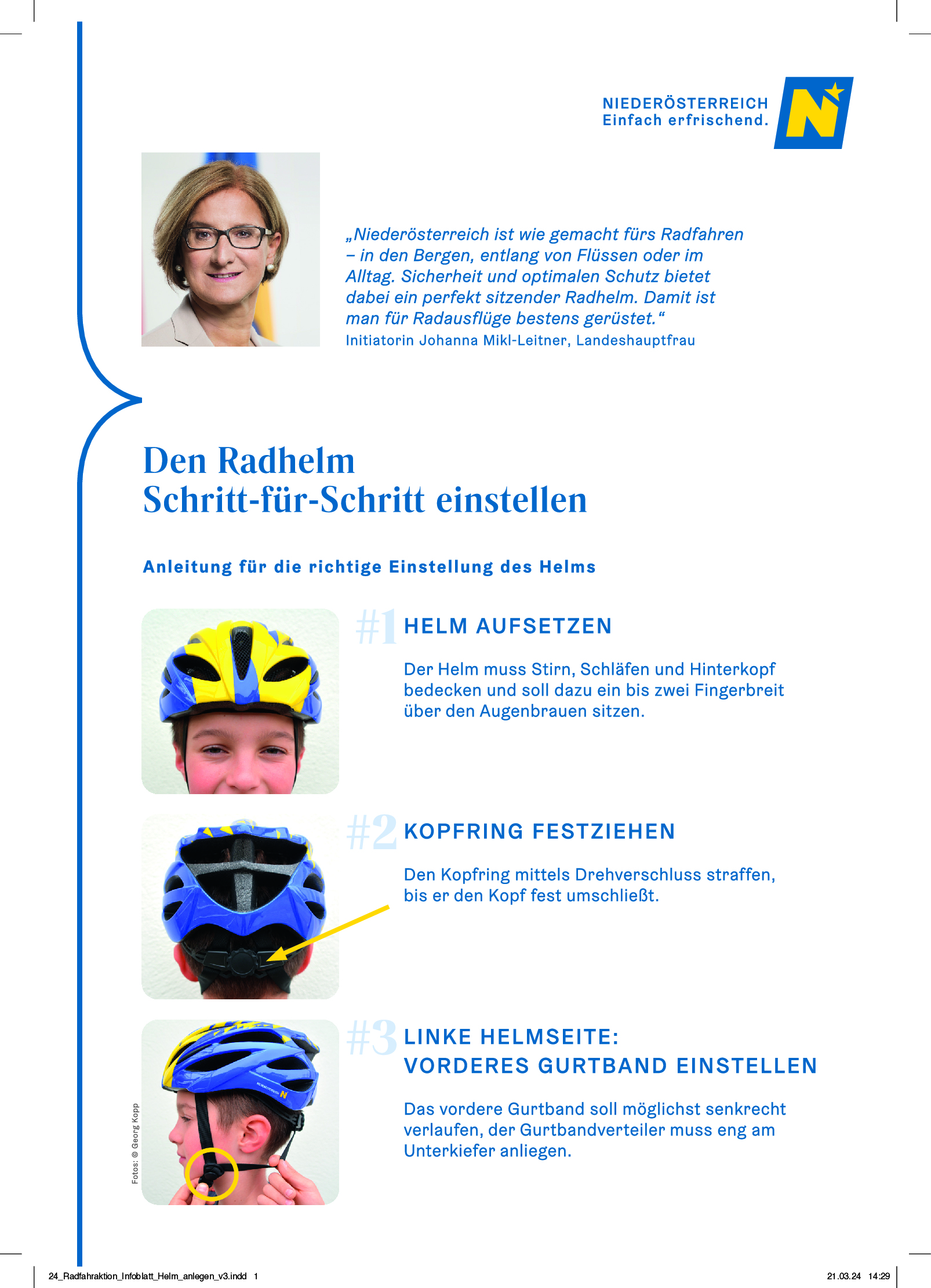 Für Kinder, Jugend und Erwachsene. Sportlich, superleicht, sicher. Der NÖ-Radfahrhelm im blau-gelben Design mit innenliegenden Headring zur genauen Anpassung an die Kopfgröße. Verstellung mittels Drehknopf. Gefördert durch das Land Niederösterreich.