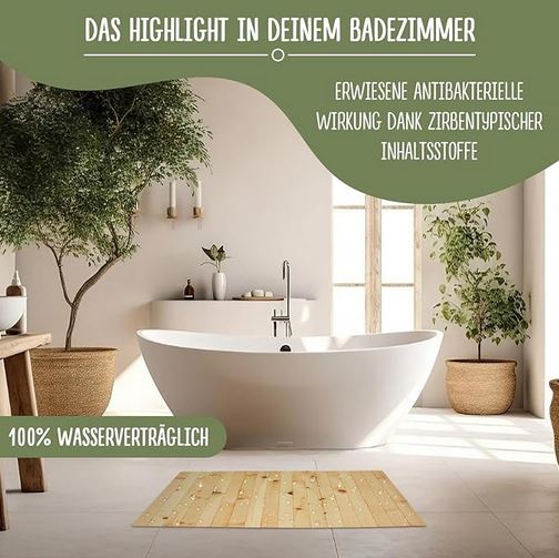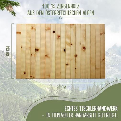 - 💚 NÄSSE ERLAUBT – Der Zirbenholzteppich darf natürlich nass werden. Gelegentliches Aufstellen zum Trocknen wird empfohlen.