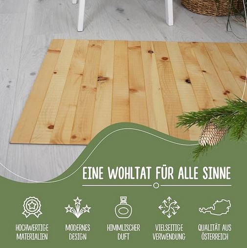 - 💚 EINE WOHLTAT FÜR ALLE SINNE – Der Zirbenholzteppich ist nicht nur für die Füße, sondern auch für die Nase ein Genuss. Der unvergleichliche Duft von Zirbenholz wirkt entspannend und beruhigend und erfüllt den ganzen Raum.